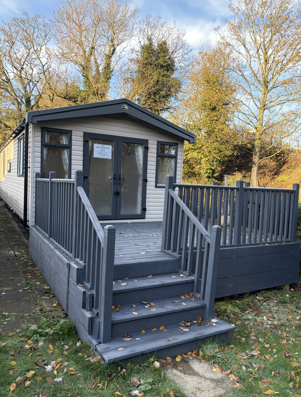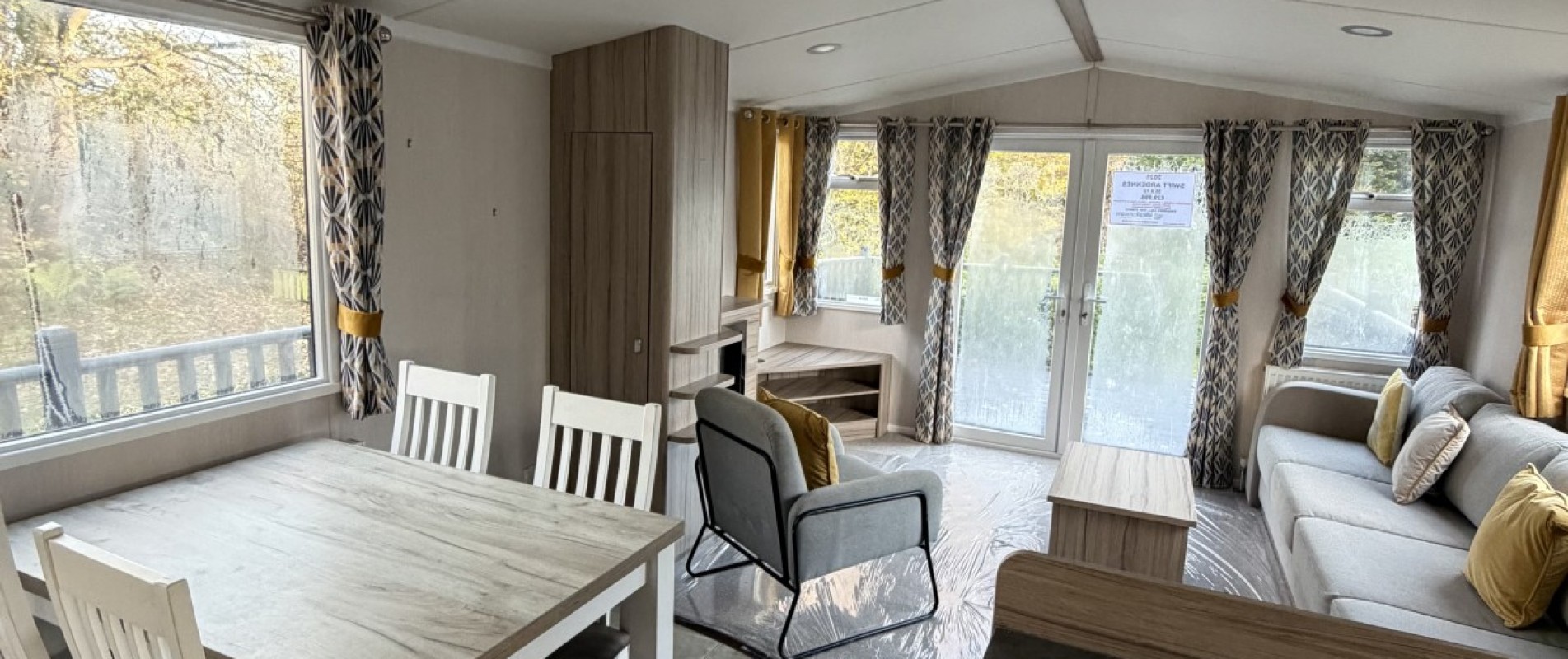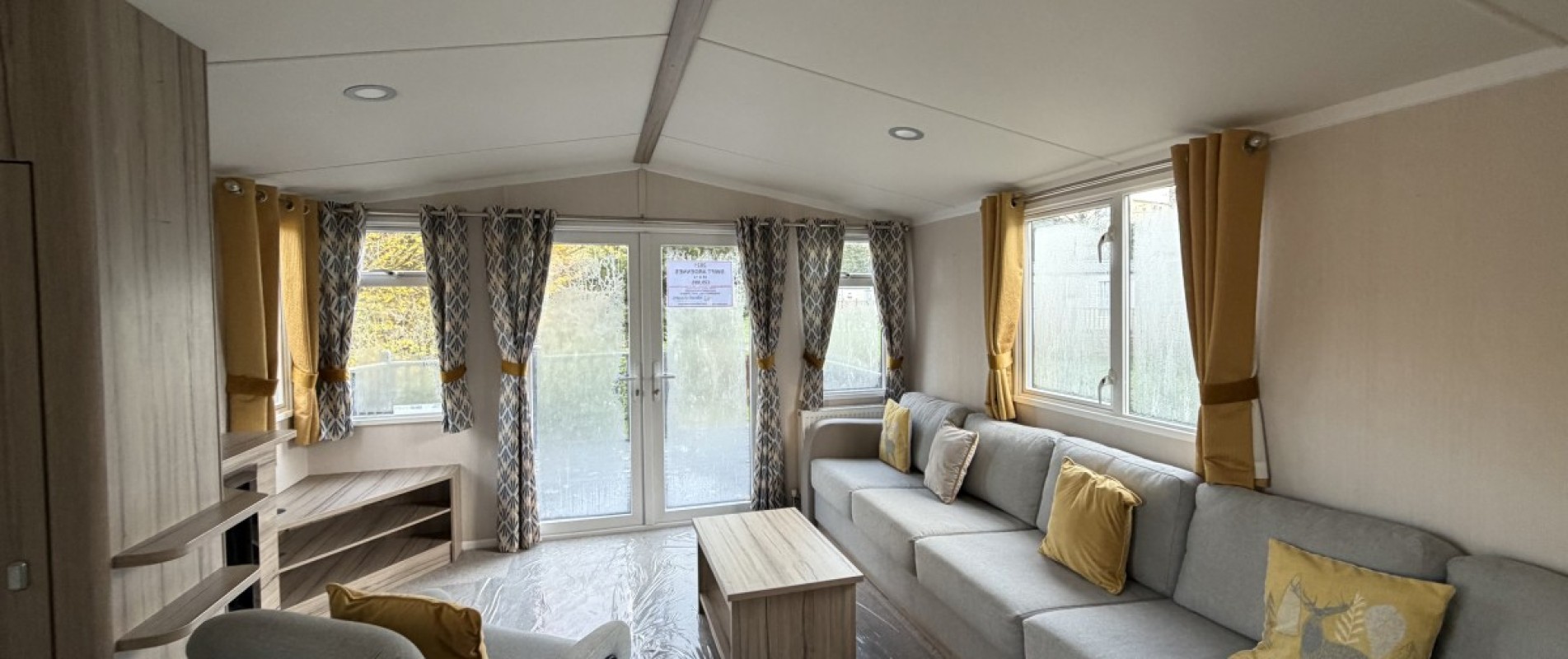 Specifications: Double glazing, fully insured , central heating, fusion galvanised chassis with environmentally exterior wood grain textured sandy beige aluminium cladding.